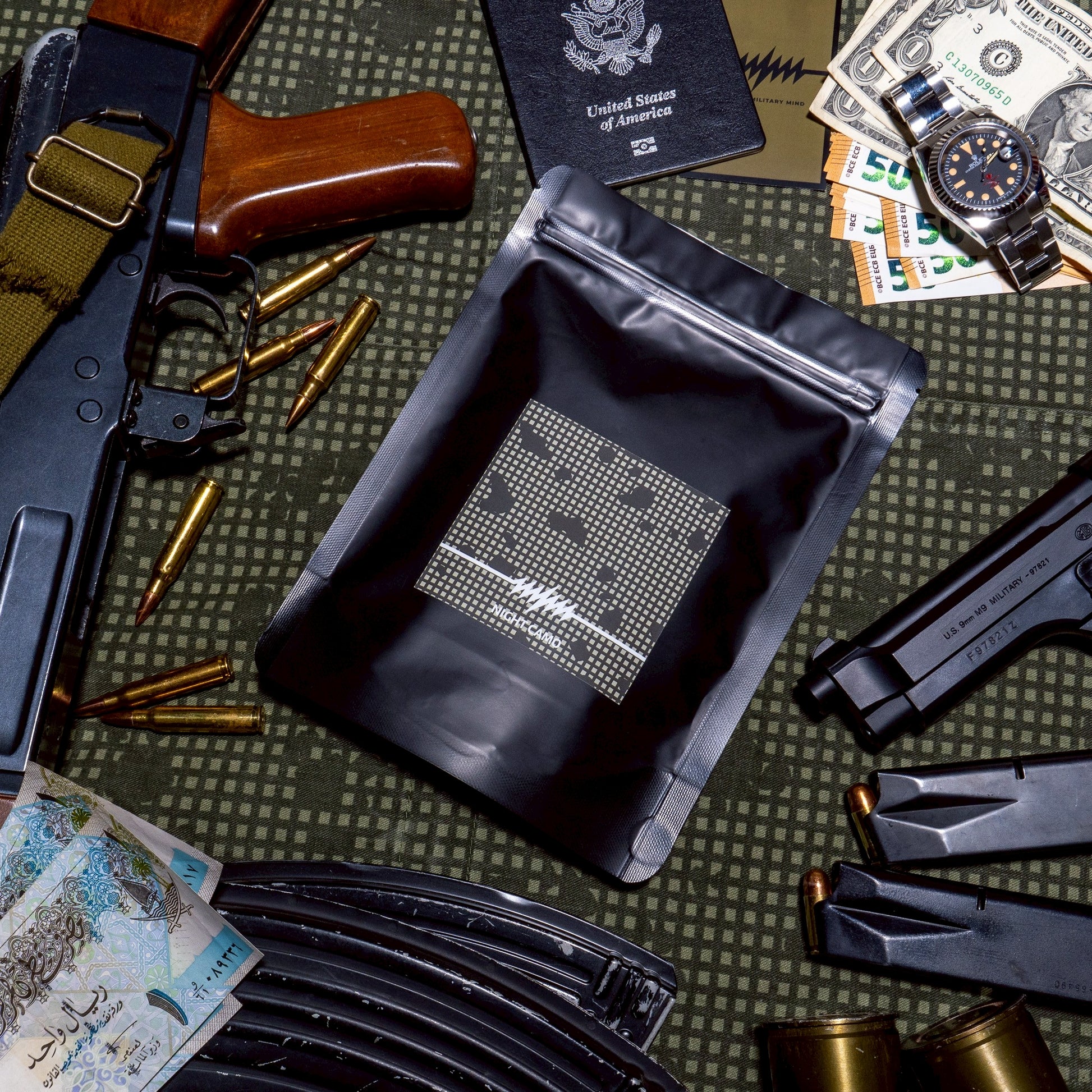 アメリカ軍が、80年代に考案したとされている対NVG(暗視ゴーグル)用の迷彩パターンとしてミリタリー界隈で異様な人気を誇る「ナイトカモ」をイメージしたコーヒーになります。当時の敵型のNVGに映りにくいよう、暗視スコープ越しのブラックスポット(増幅管の丸い小さなムラ)を意識したグリーンベースの迷彩で、本当に効果があったのかどうにも定かでない不思議なテキスタイル。